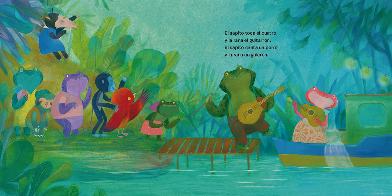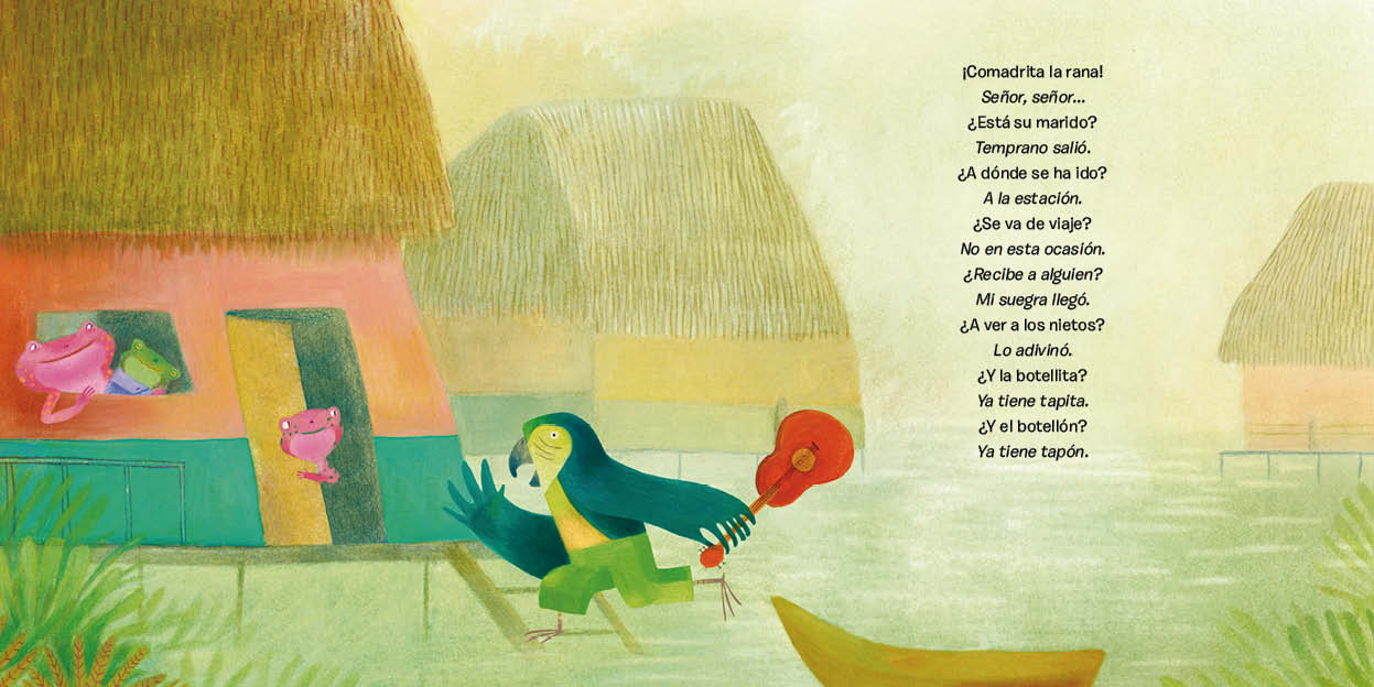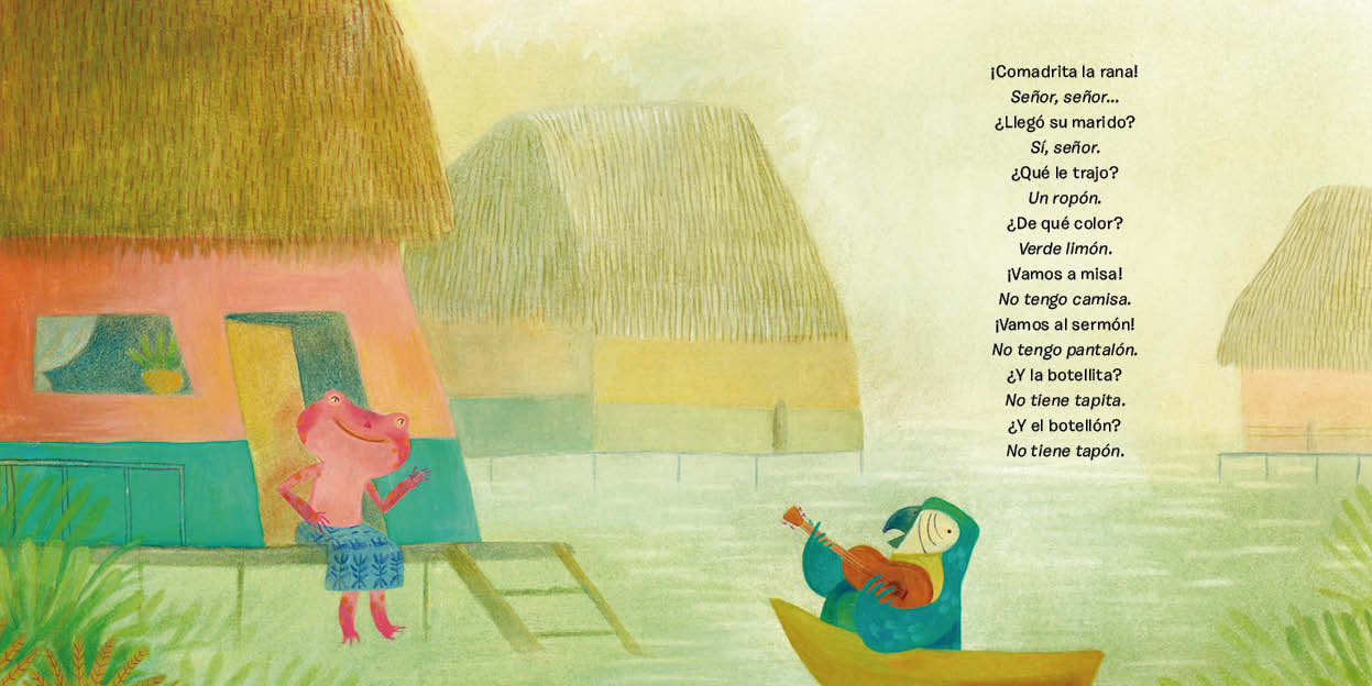 Este libro parte de la muy conocida canción de la tradición oral, Comadrita la rana. Pilar Posada hace una muy divertida versión donde, partiendo del estribillo original de la canción, desarrolla una historia que recrea la boda entre la rana y el sapo. Con humor se describe esta bella celebración donde toda la laguna se viste de gala y los nervios se alborotan. En esta historia la expresión de los personajes, bellamente recreados por Paula Ortiz, el color de una naturaleza vibrante y el ritmo del texto nos hacen viajar por una verdadera experiencia sensorial.