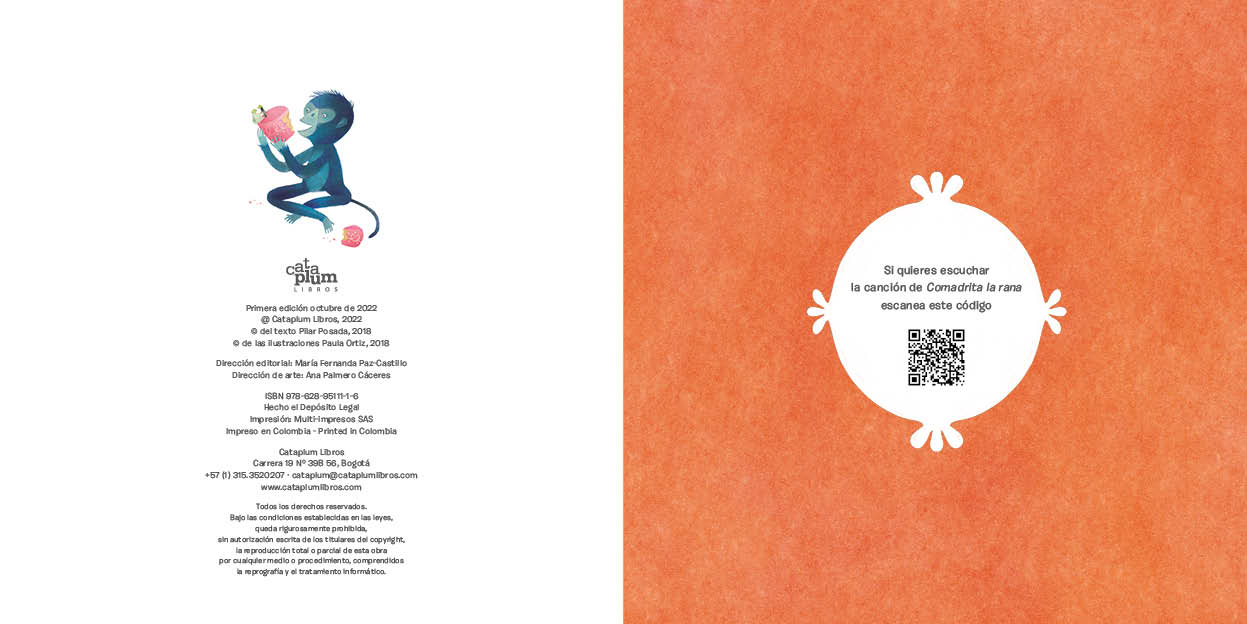 Comadrita la rana es un libro lleno de música, de imágenes evocadoras y una historia divertida y llena de ocurrencias. El color en este libro se puede considerar como un personaje más: tal es su variedad y profundidad. Además el lector encontrará en su interior un código QR y podrá acceder a la versión musicalizada por Pilar Posada de esta maravillosa obra.