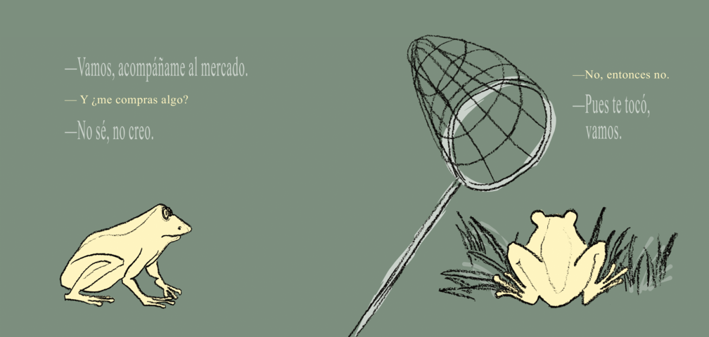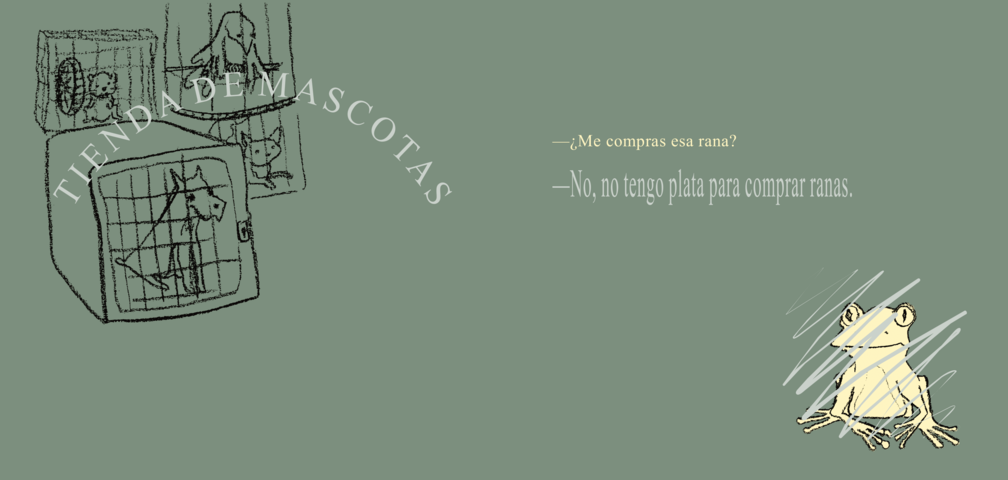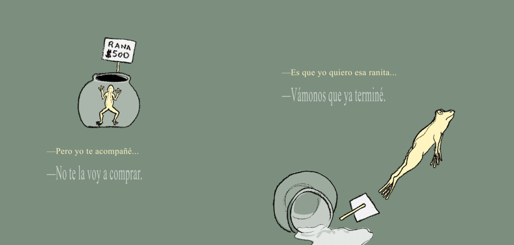 Una historia aparentemente sencilla, pero presentada de manera inteligente y ambigua a la vez, dejando en el lector múltiples sensaciones superpuestas a través de situaciones sutilmente sugeridas que actúan como un disparador. La psique del lector se llena de sensaciones, de sentimientos y emociones que se multiplican. Rana es un libro juguetón. Es una historia que recrea una típica situación entre una madre y una niña. Amor a primera vista, como dijo una lectora. El deseo de la niña es tan fuerte que salta de la pecera. De allí en adelante la historia se resuelve a través de un ágil diálogo entre madre e hija, madre rana, o madre madre. De nuevo la ambigüedad.