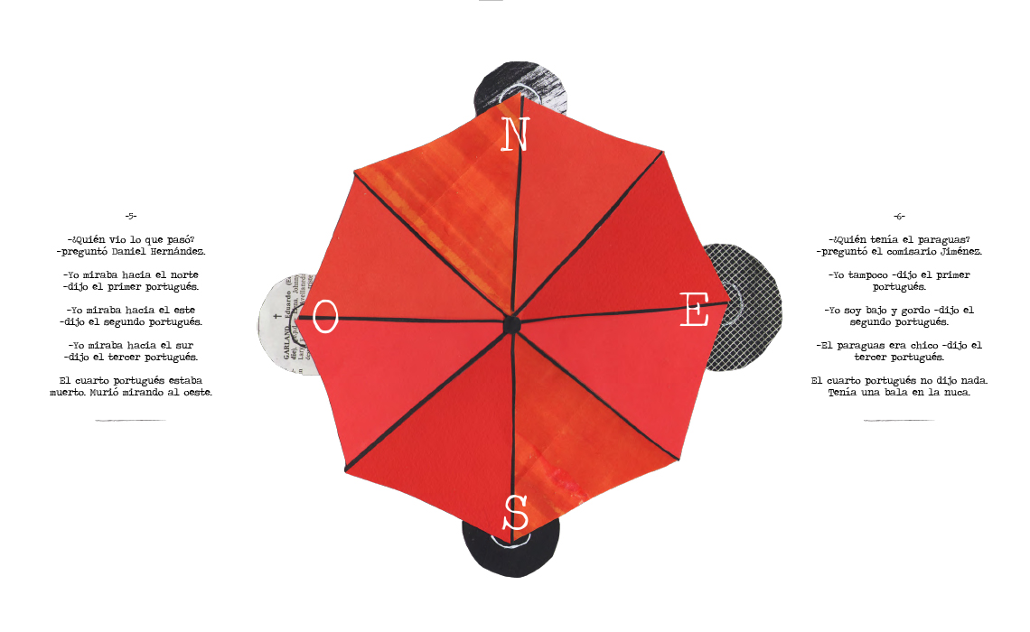 “Un portugués muerto de un balazo en la nuca y otros tres junto a él, que no vieron nada. Difícil caso para el comisario Jiménez, pero no para la magistral pluma de Rodolfo Walsh. Una ráfaga de literatura policial interpretada en forma innovadora por la diseñadora y artista plástica Inés Calveiro.